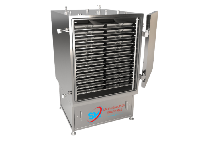 A vacuum tray dryer is a batch drying machine with a sealed vacuum chamber containing stacked heated shelves and removable trays. Reduced pressure lowers the boiling point of moisture, enabling drying at lower temperatures — ideal for heat-sensitive and oxygen-sensitive products. (Powder Systems Ltd)